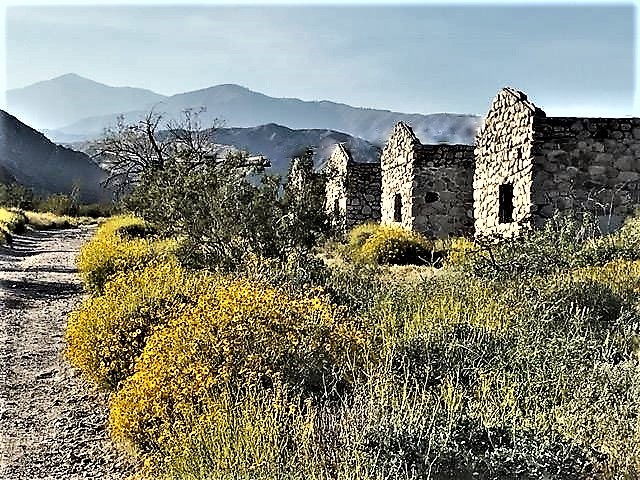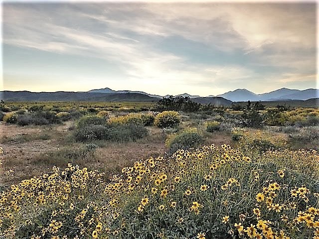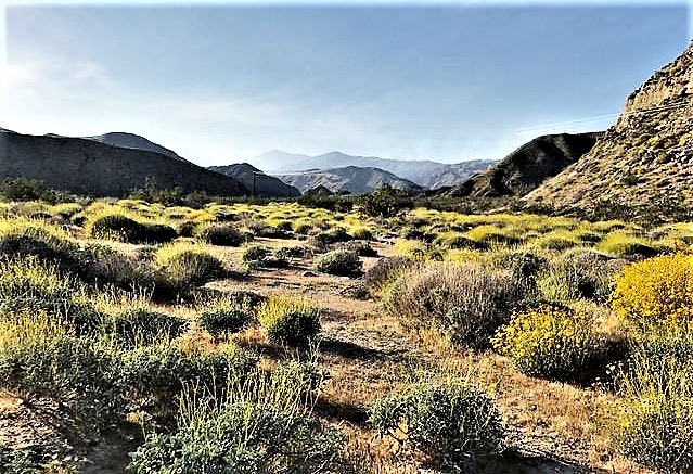 Mission Creek Preserve. Looking toward the San Gorgonio Mountains. The Pacific Crest Trail crosses in the distance. Brittlebush a’bloom.
