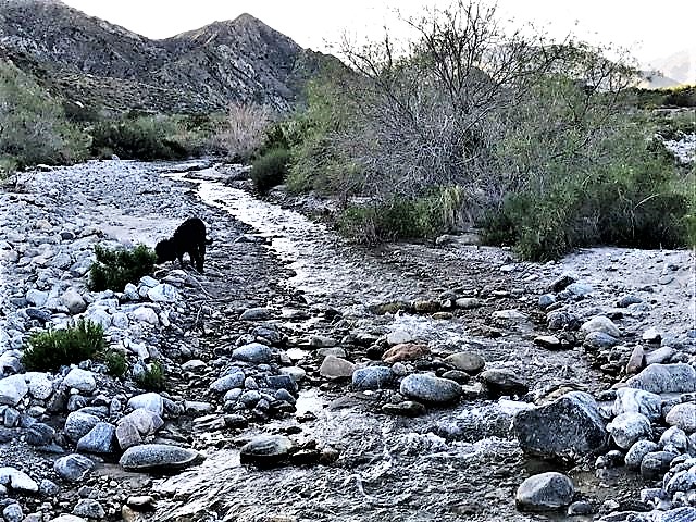 Mission Creek in the Mission Creek Preserve. With a rare sighting of a wooly labradoodle.