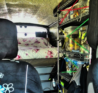 The van turned out awesome. At every step I kept the goal of a nontoxic and mold-resistant end result foremost in my mind. Aesthetic aspects came second, but I must say that the Himalayan salt headboard and the pressed floral “tin” ceiling have pleased my city girl sensibilities.
