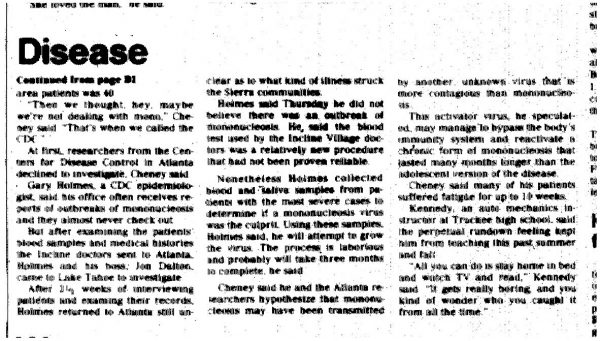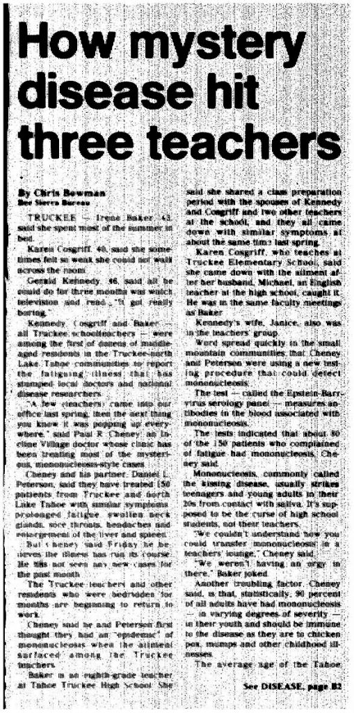 “A few teachers came into our office last spring, then the next thing you know, it was like popping up everywhere.” said Paul R Cheney, an Incline Village doctor whose clinic has been treating most of the mysterious mononucleosis-style cases.