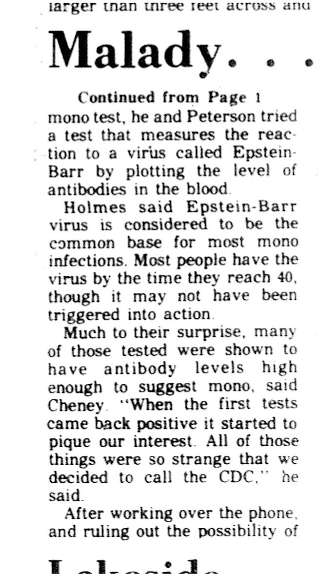 Much to their surprise, many of those tested were shown to have antibody levels high enough to suggest mono, said Cheney. “When the first tests came back positive it started to pique our interest. All of these things were so strange that we decided to call the CDC.” he said.