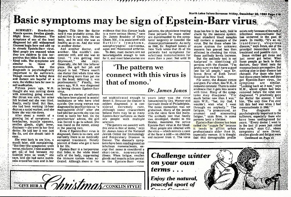 “One of the crucial problems of finding a cure,” says Brus, “is, Why do some people have chronic Epstein-Barr virus? What makes the latency? Is it a change in the immune system? Is this virus an innocent virus? Until these questions are answered, we cannot find a cure unless by serendipity.”