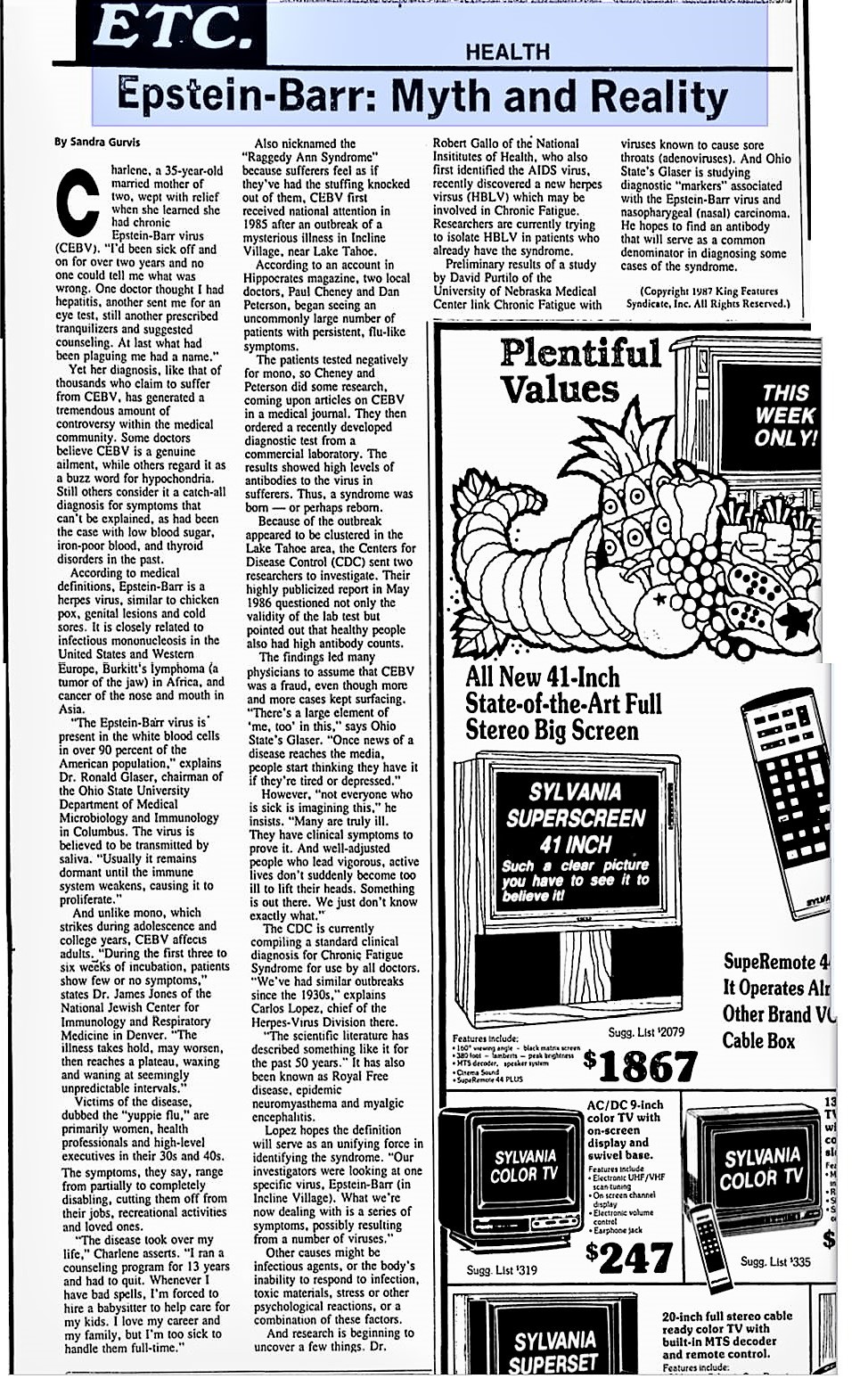 “Victims of the disease, dubbed the “yuppie flu” are primarily women, health professionals and high level executives in their 30’s and 40’s. The symptoms, they say, range from partially to completely disabling, cutting them off from their jobs, recreational activiities and loved ones.