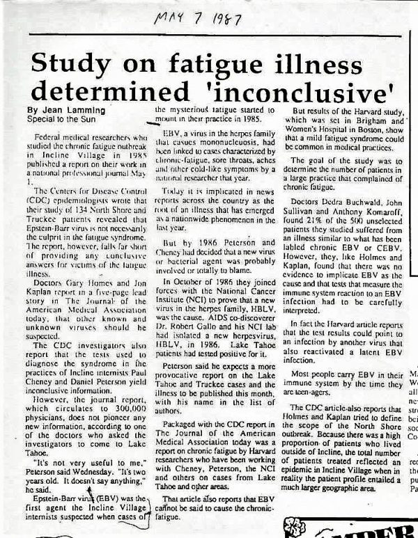 Packaged with the CDC report in The Journal of the American Medical Association today was a report on chronic fatigue by Harvard researchers who have been working with Cheney, Peterson, the NCI and others on cases from Lake Tahoe and other areas. That article also reports that EBV cannot be said to cause the chronic fatigue.